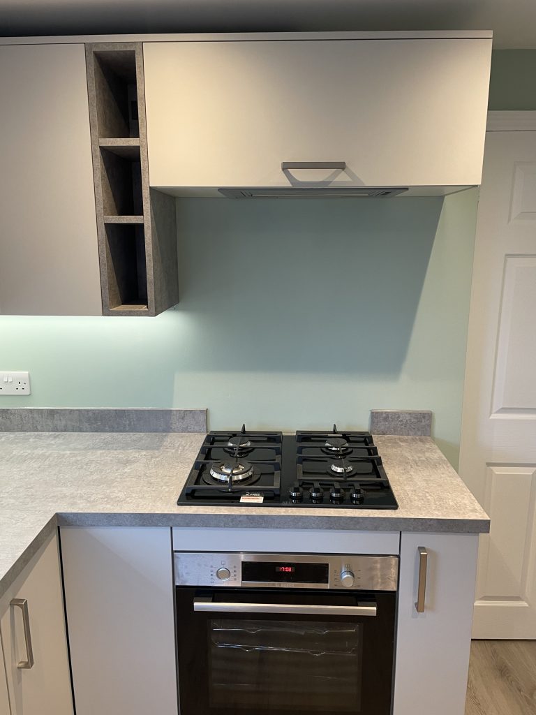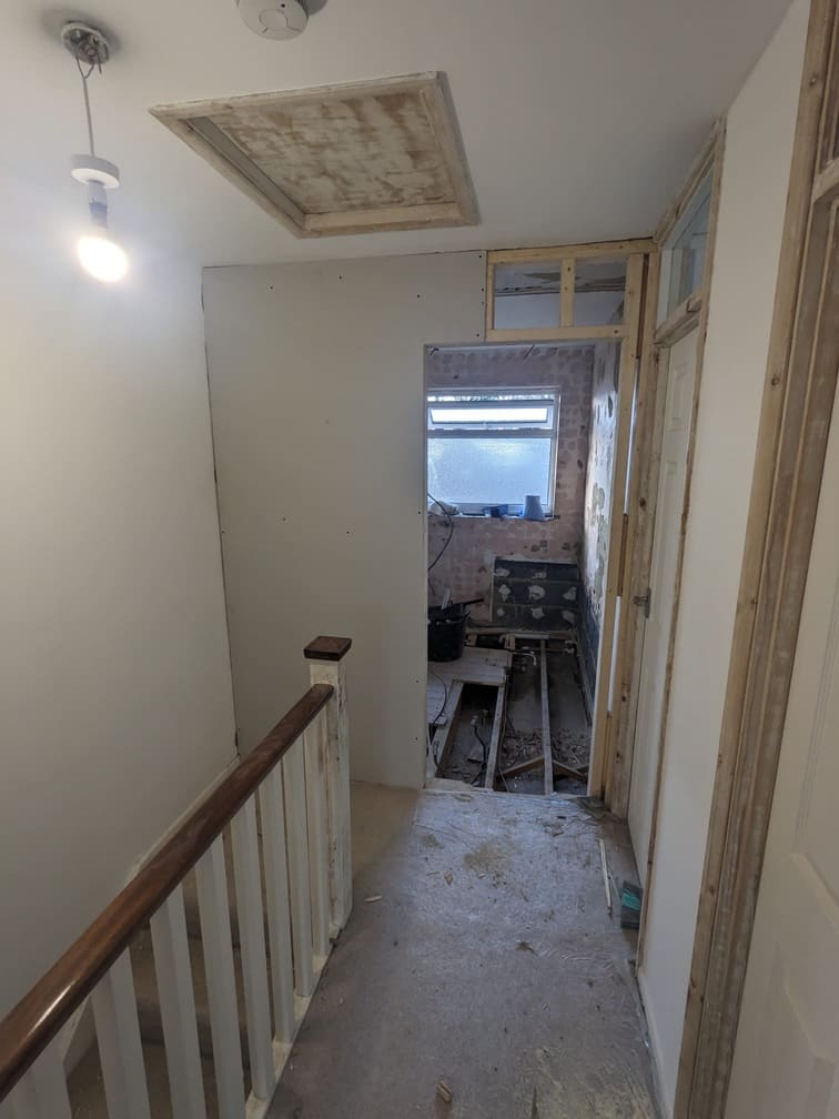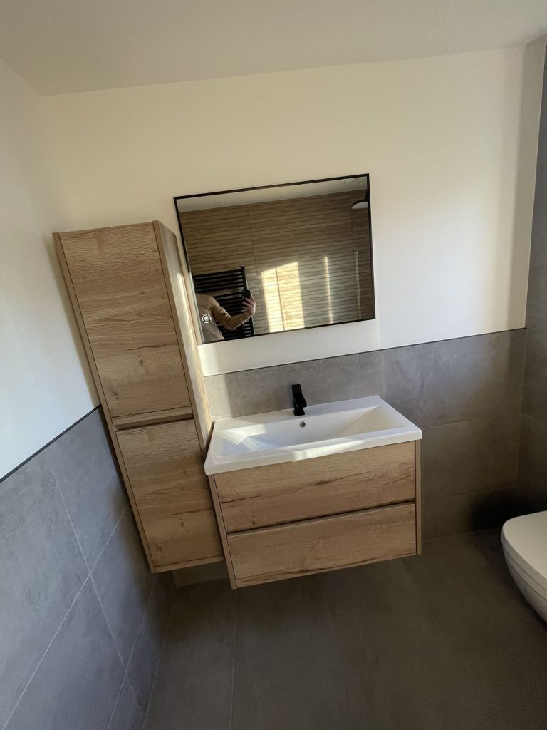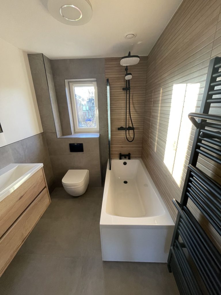 This exceptional bathroom transformation showcases modern Scandinavian design with warm wood-effect vanity units and sleek grey large-format tiles. The stunning wood-textured feature wall creates a spa-like atmosphere, complemented by black fixtures and contemporary lighting. Our Reading clients were thrilled with the sophisticated floating vanity with integrated storage and the luxurious bathtub installation. The thoughtful design maximizes natural light while creating a perfect balance of functionality and style.