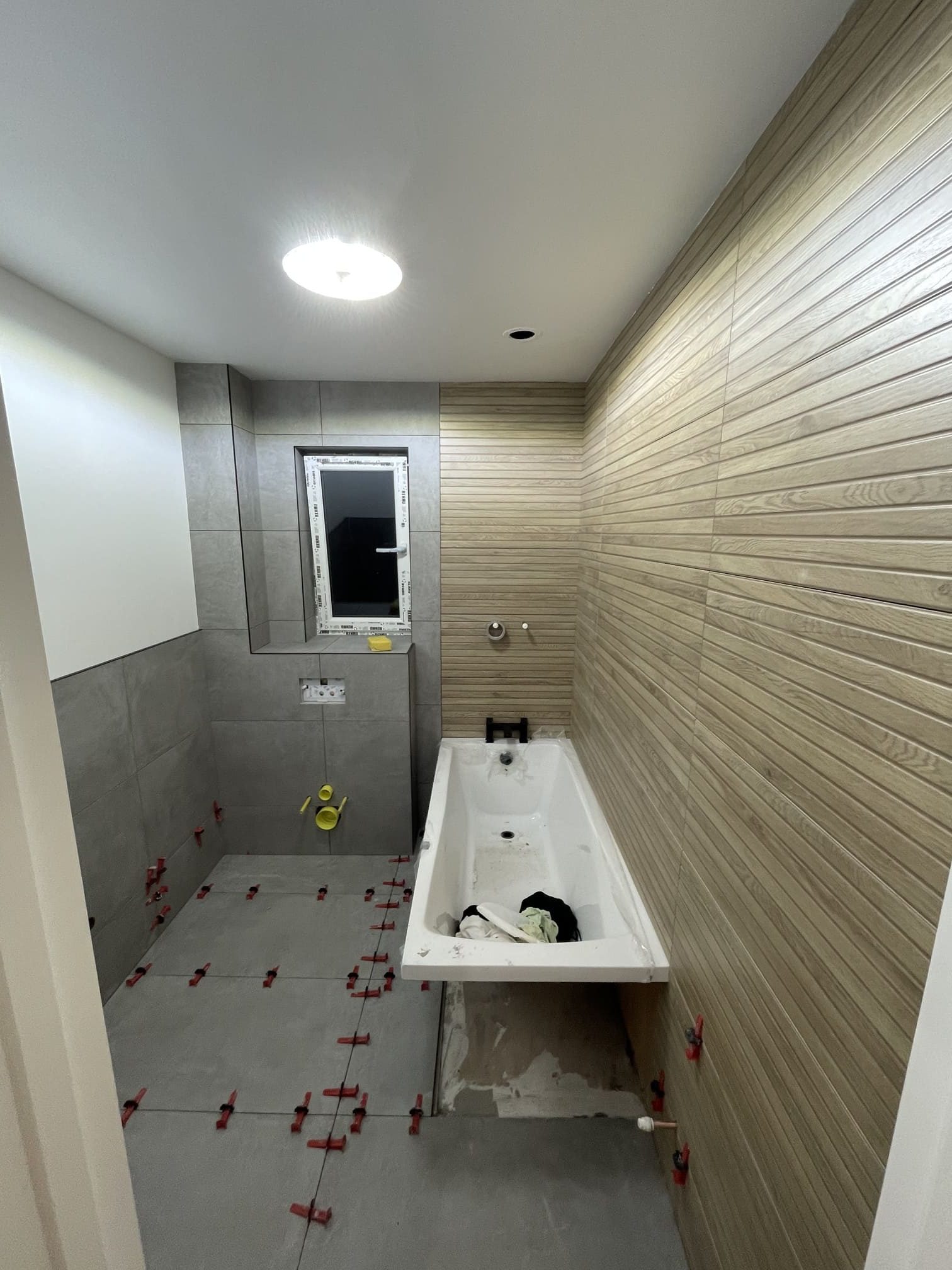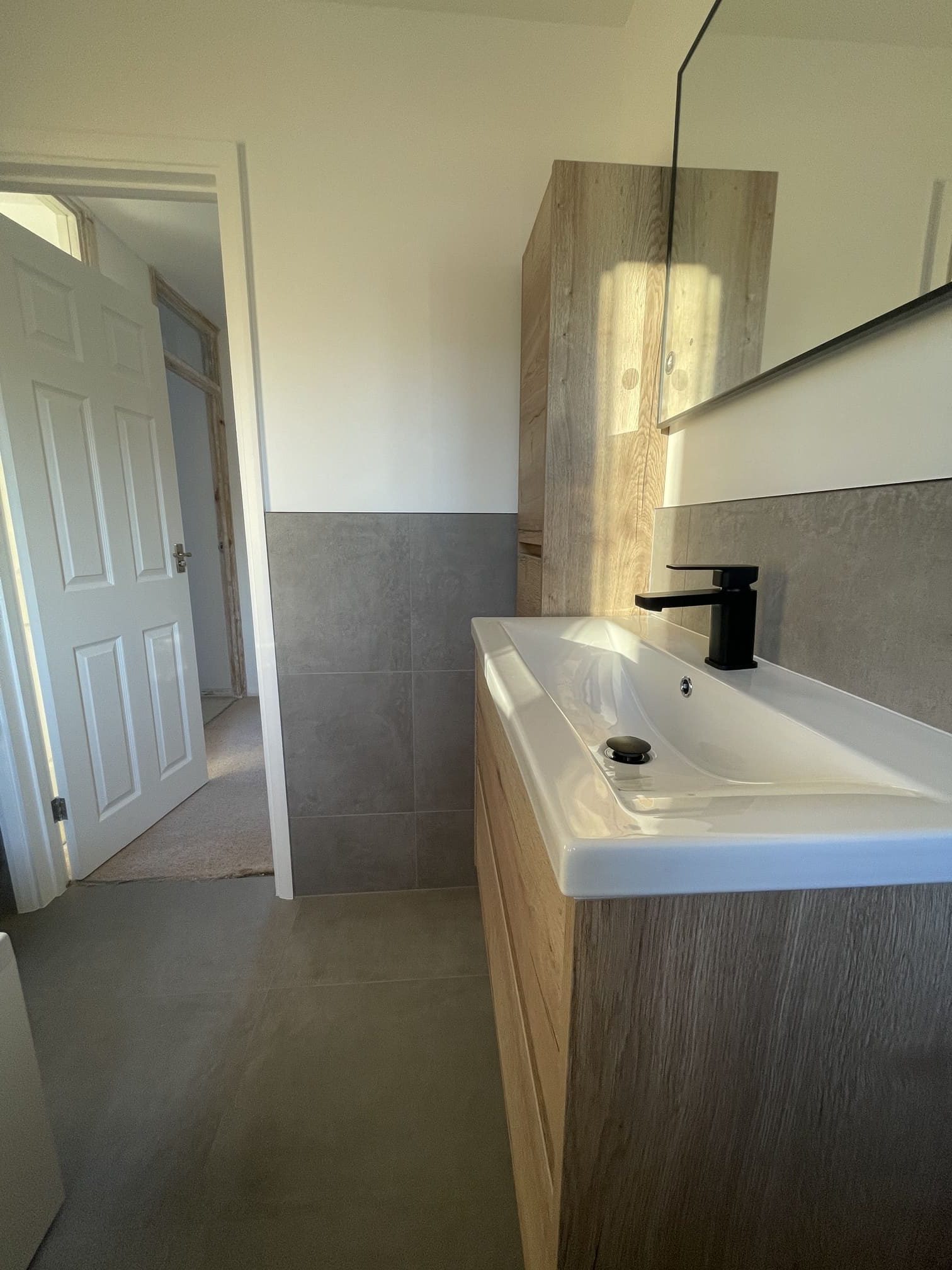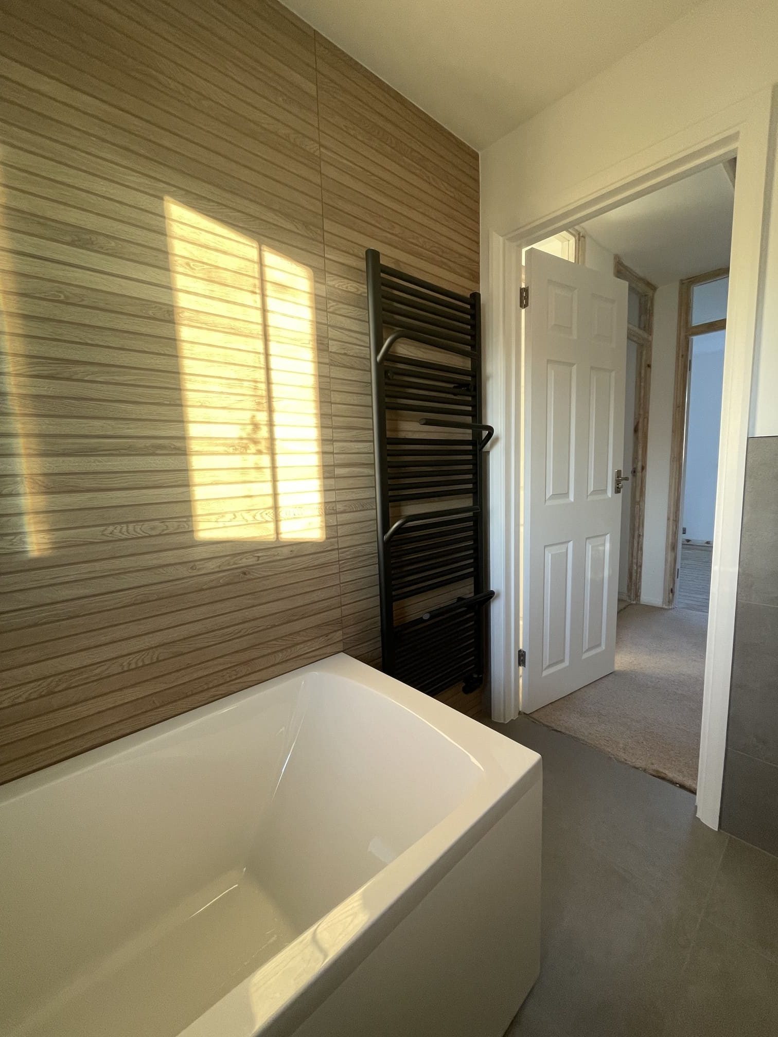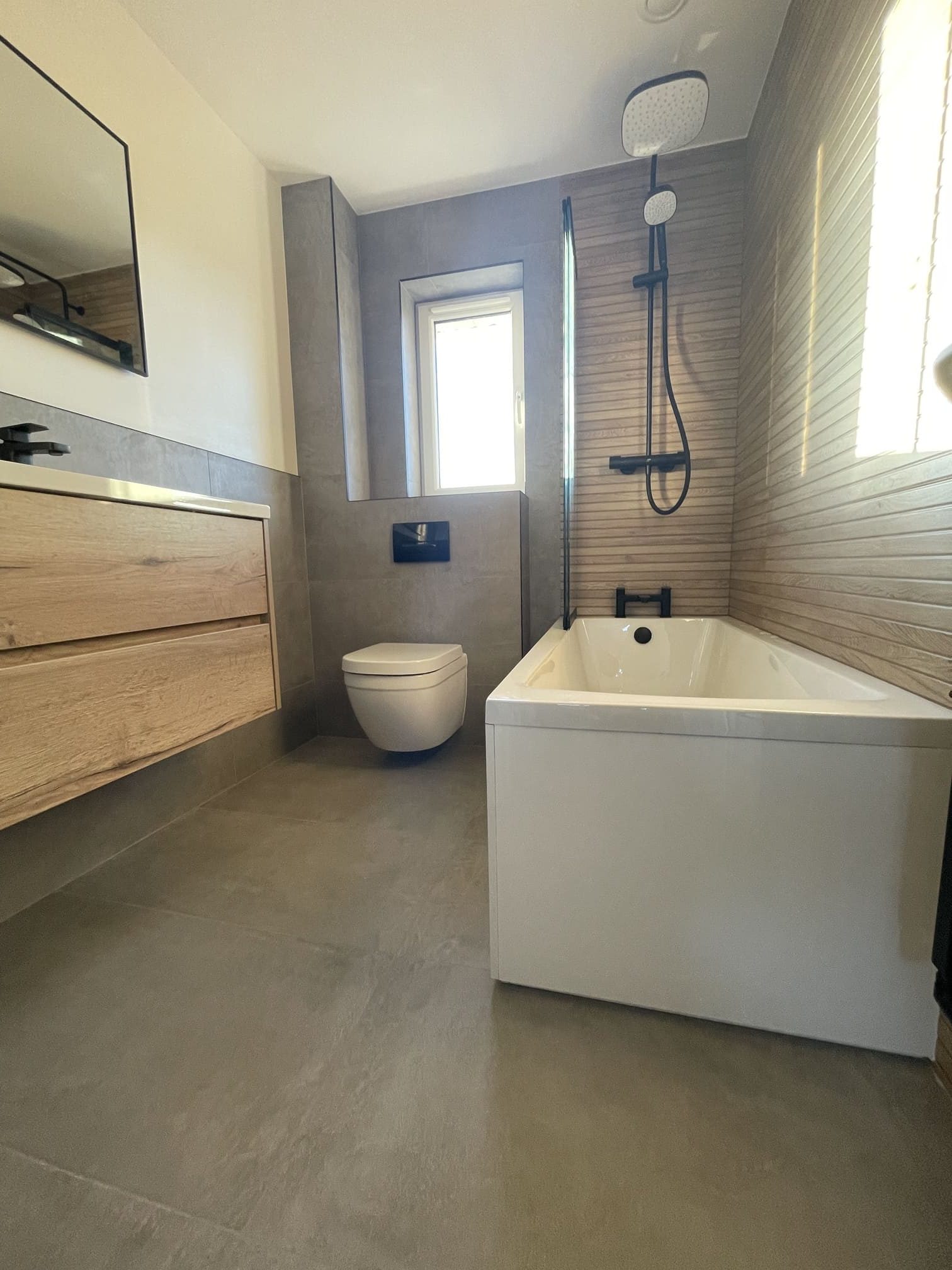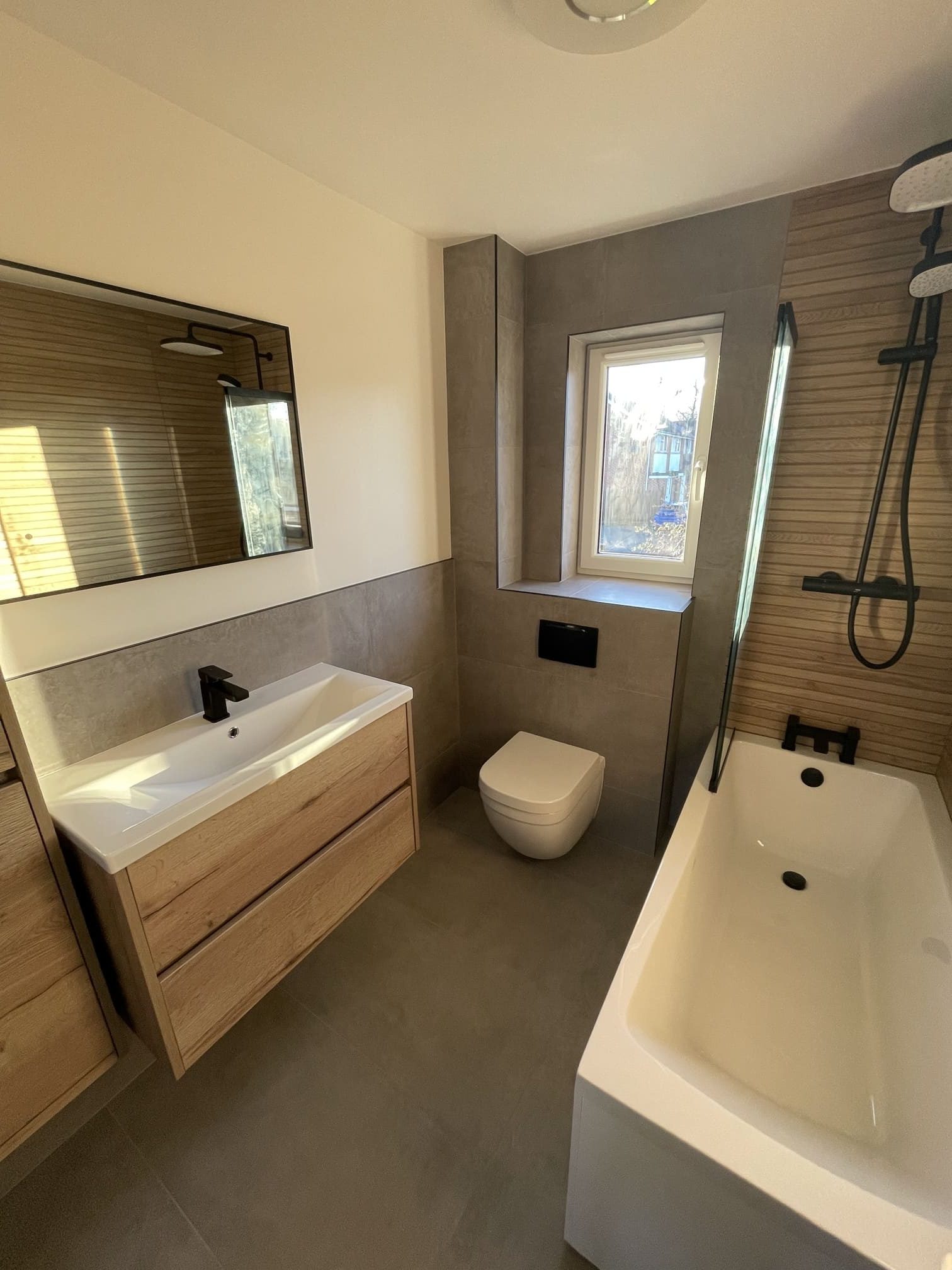 This exceptional bathroom transformation showcases modern Scandinavian design with warm wood-effect vanity units and sleek grey large-format tiles. The stunning wood-textured feature wall creates a spa-like atmosphere, complemented by black fixtures and contemporary lighting. Our Reading clients were thrilled with the sophisticated floating vanity with integrated storage and the luxurious bathtub installation. The thoughtful design maximizes natural light while creating a perfect balance of functionality and style.